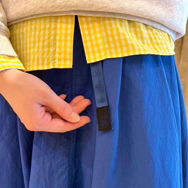 着回しアイテムのスカートは、ナイロン素材なので耐久性◎!シワもつきにくい!春のレジャーシーンやお子さんと公園で遊ぶ時に重宝しそうです!