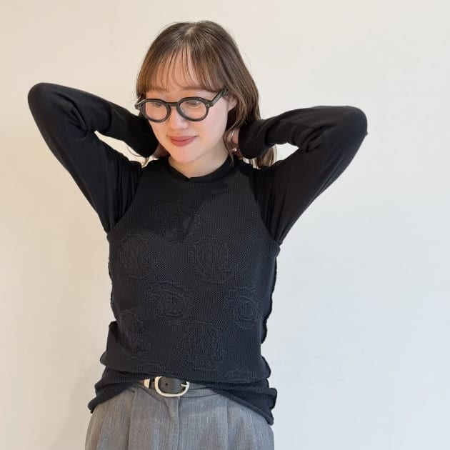 少し見えにくいのですが、〈TAN〉のニットベストを重ねています!