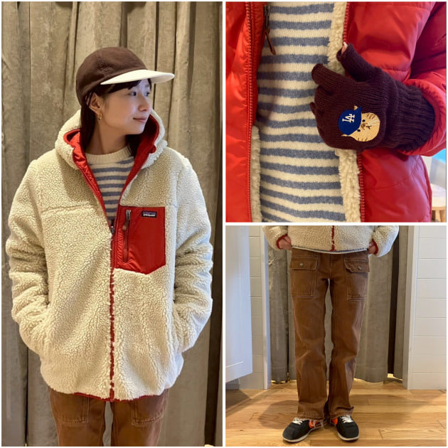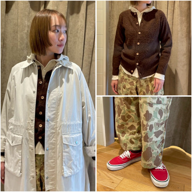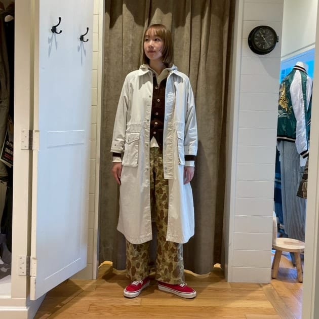 2026年への気合いとして〈BUZZ RICKSON'S〉別注のカモ柄パンツをビシッと合わせ、全体的にアイボリーやブラウンでまとめました。赤のスニーカーをアクセントにしたのがポイント。車移動の日は、薄手のアウターで春気分もおすすめです♩