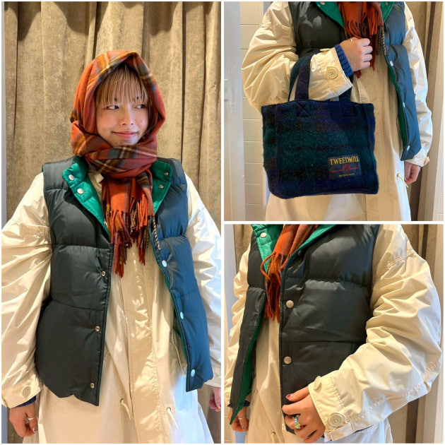 今回M-65は158cmでサイズ2着用ですが、ボリューム感が気になる方はサイズ1の方がおすすめです。ダウンベストはリバーシブル仕様なので1着で2倍楽しめます◎マフラーは頭まで被ると可愛くて、しっかり暖かいですよ♪