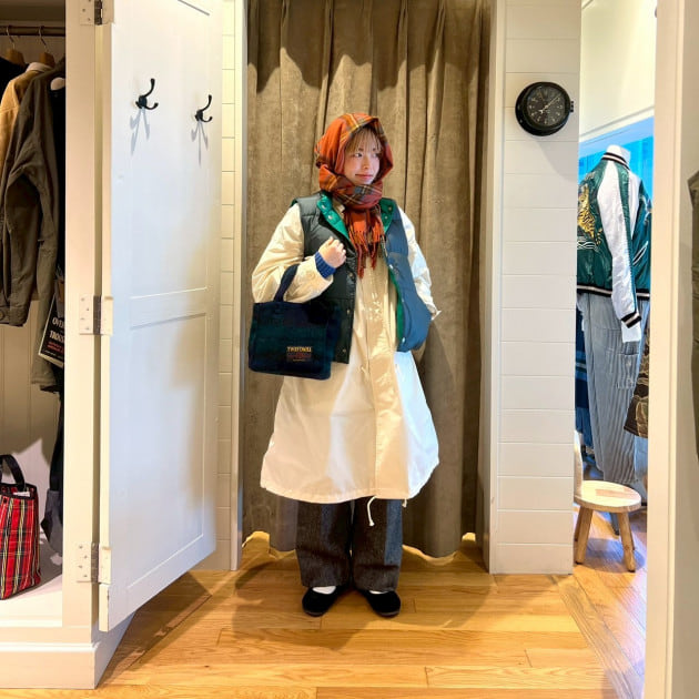 “お正月”をテーマに私が選んだアイテムは、白のM-65パーカ、緑のダウンベスト、オレンジのマフラー。みなさんもうお気づきですか、、?!そう!鏡餅ですーー!!!お正月といえば真っ先に鏡餅が浮かんだので、思いきって自分が鏡餅になってみました^_−☆