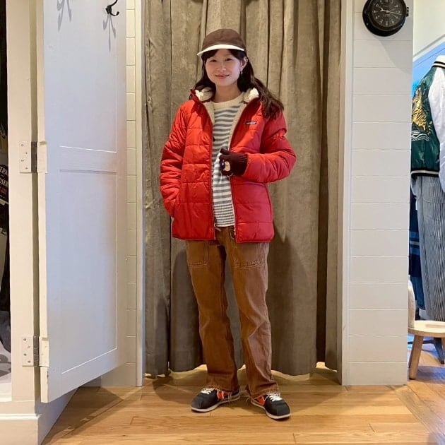 〈patagonia〉のキッズリバーシブルレディ フレディフーディはキッズのXXLのサイズ。レディースでいったらだいたいM〜Lサイズくらいの、私が着ると肩周りなどゆとりのあるサイジング。汗ばんでも冷えずに保温性を保てるような機能もあり、外でもあたたかく、室内に入っても快適なアウターです♪
