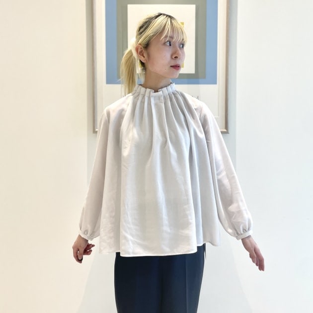 ブラウスは肩周りはジャスト、身幅は締め付け感なく、ゆったり。