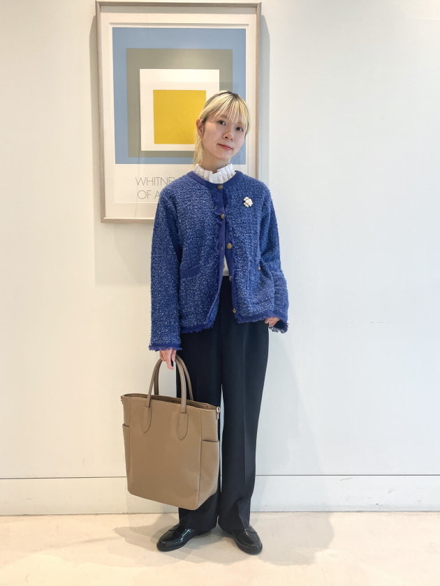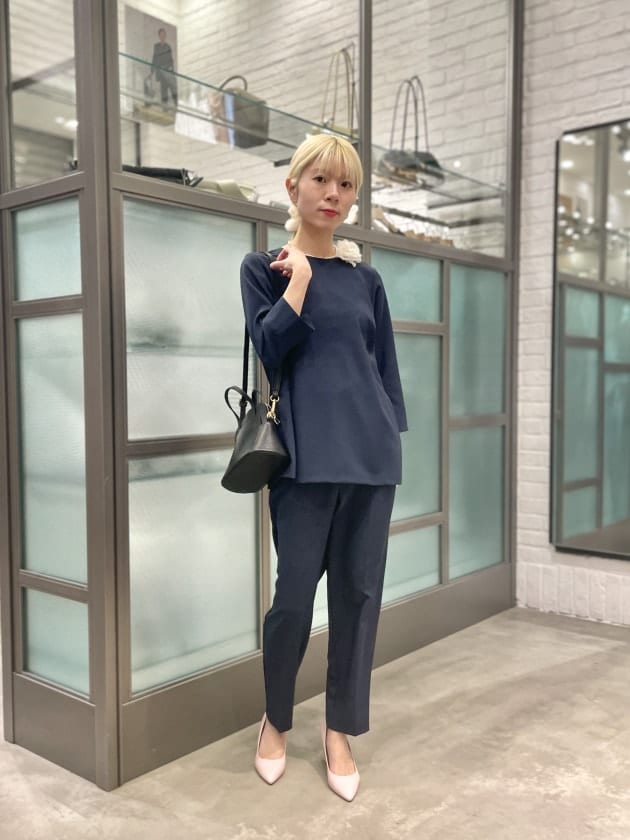 ペフラムシルエットなので、ボトムスはタイトスカートや、すっきりとしたシルエットのパンツがバランス良くまとまります。