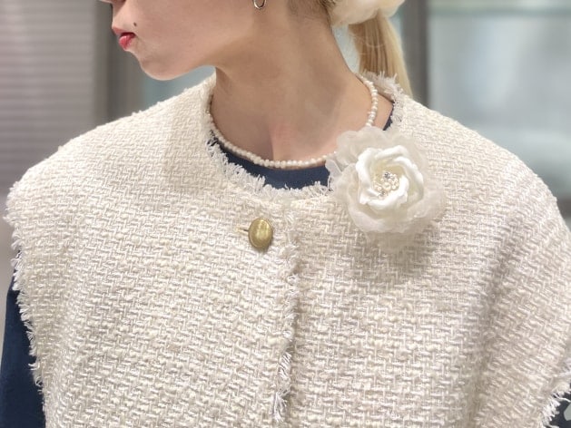 コサージュやネックレスを合わせて。
