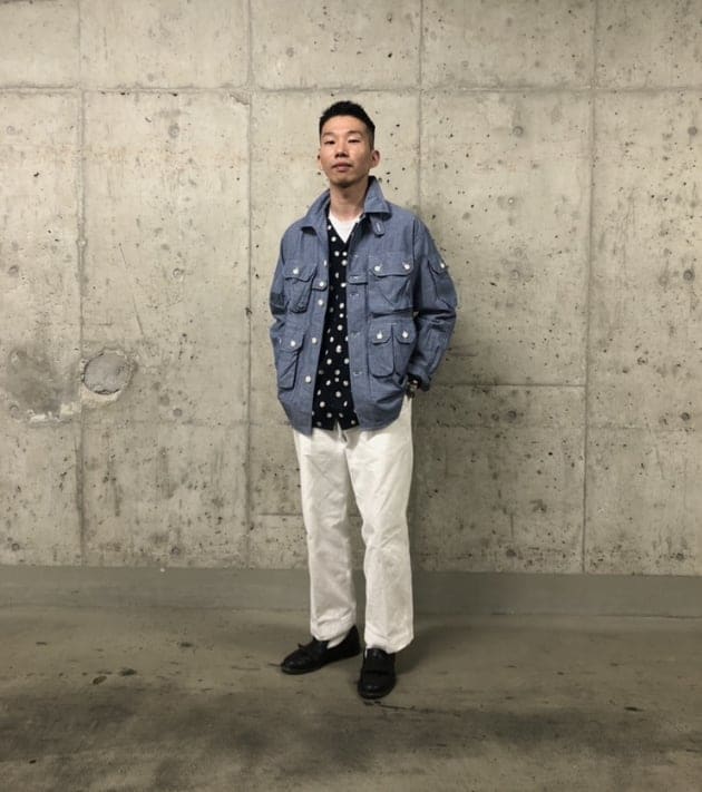 ミリタリーパンツの武骨な雰囲気によくあうMOJITOのアブサンシャツとサンバレーロッジカーディガン。