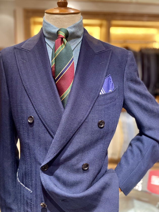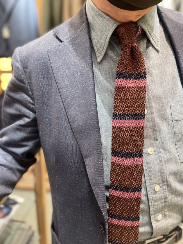 シャツはBEAMS Fの定番であるシャンブレータブカラー。タイは〈Atto Vannucci(アット ヴァンヌッチ)〉のネイビーのニットタイ。アズーロ エ マローネを意識したかどうかはうかがっていません。