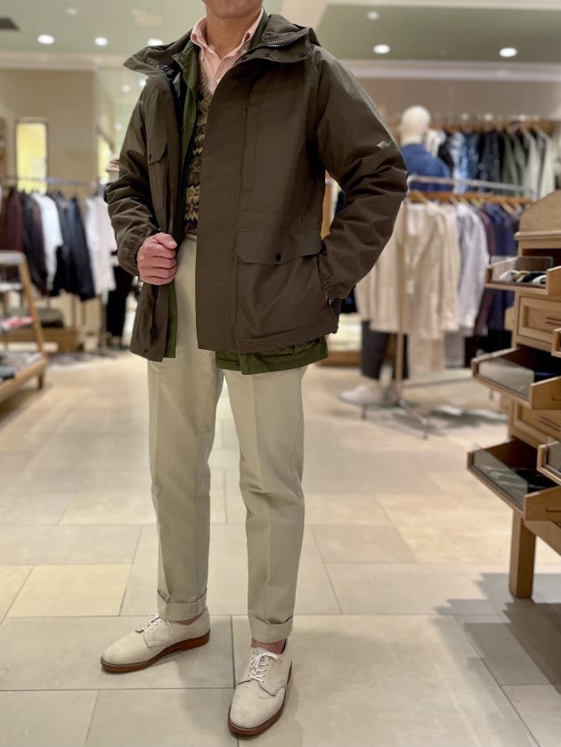 ちなみに176cm、70kgのがっちり体型の僕の場合。カットソー1枚だとMサイズ、ジャケットの上だとLサイズを着用します!