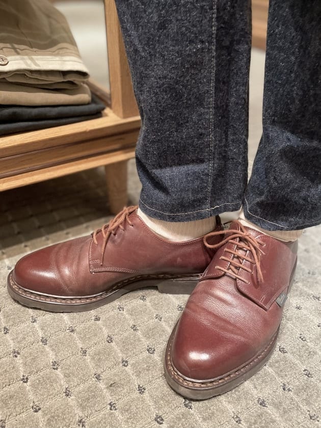 足元は定番のダークブラウンスエードのタッセルローファー。ソックスも定番のカラーソックスのライトチャコール。