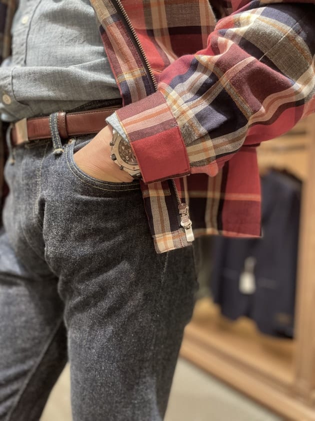 トラウザーズは〈GERMANO(ジェルマーノ)〉の1プリーツ。チラッと見えるスターリングシルバーのバックルとリザードもいい感じ。