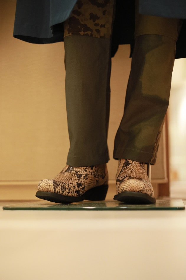 てっぺんから端まで抜かりない柄物ずらしのコーディネート。