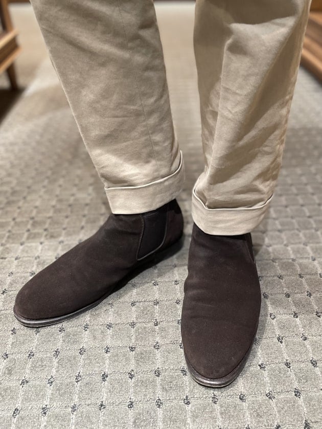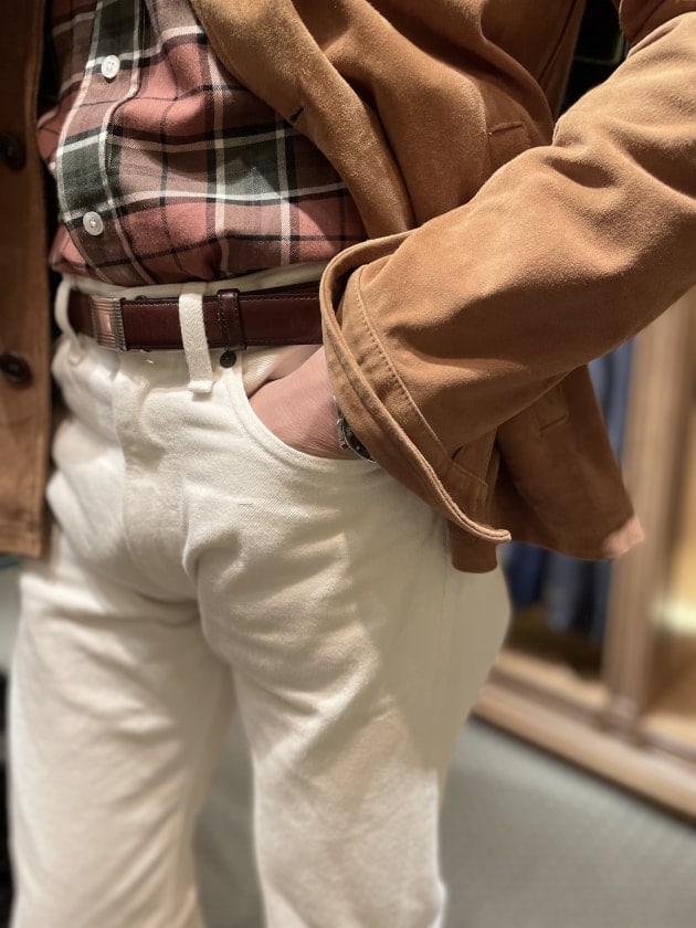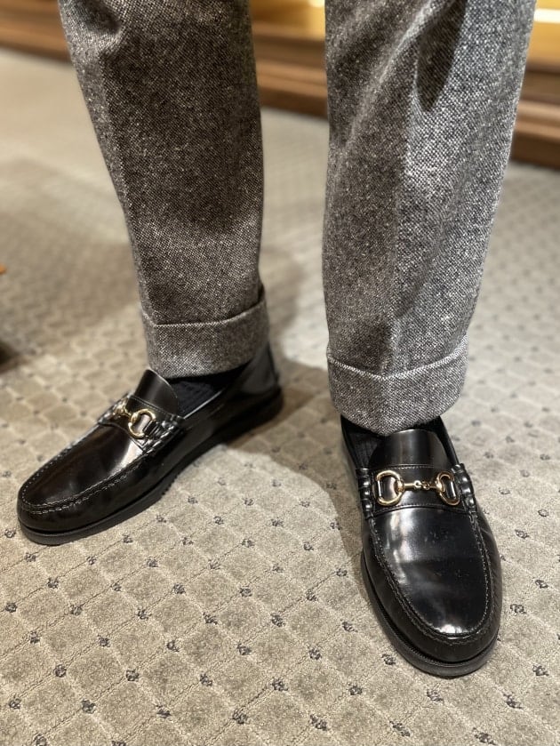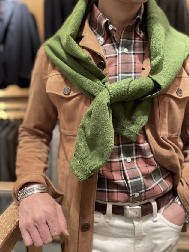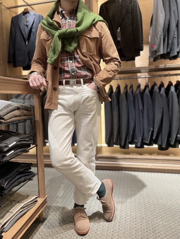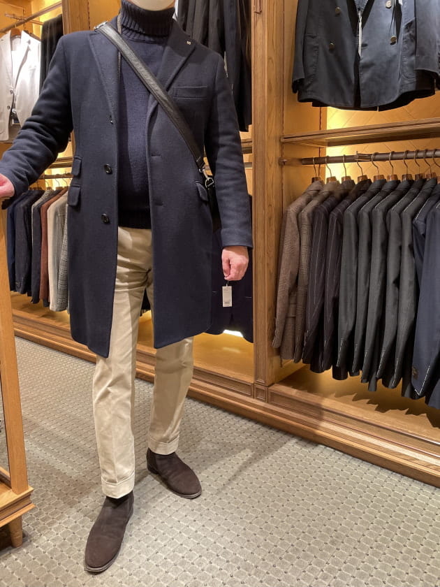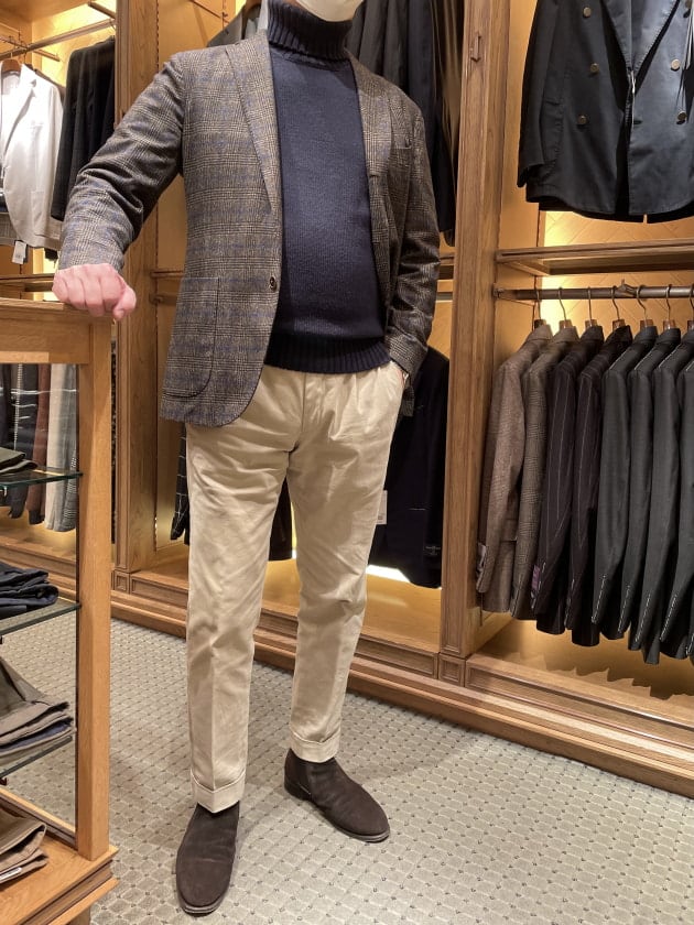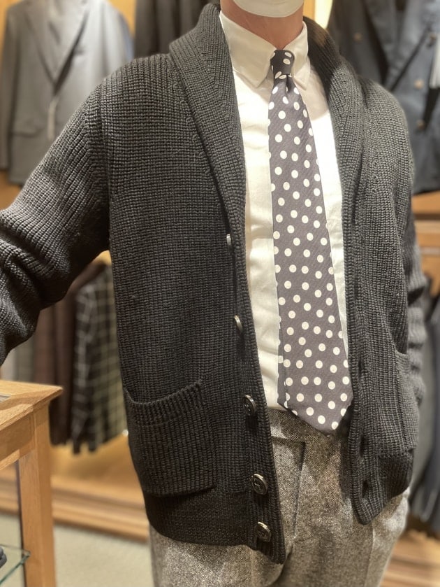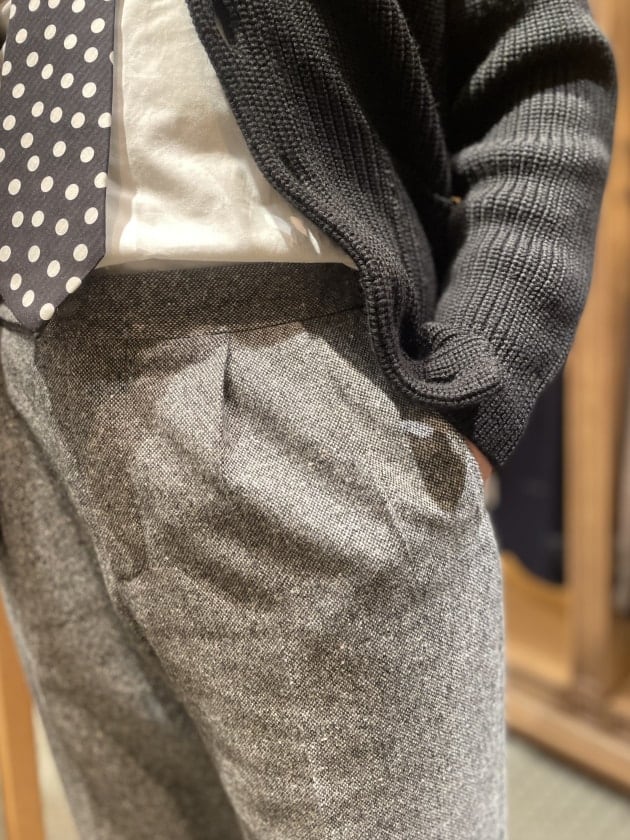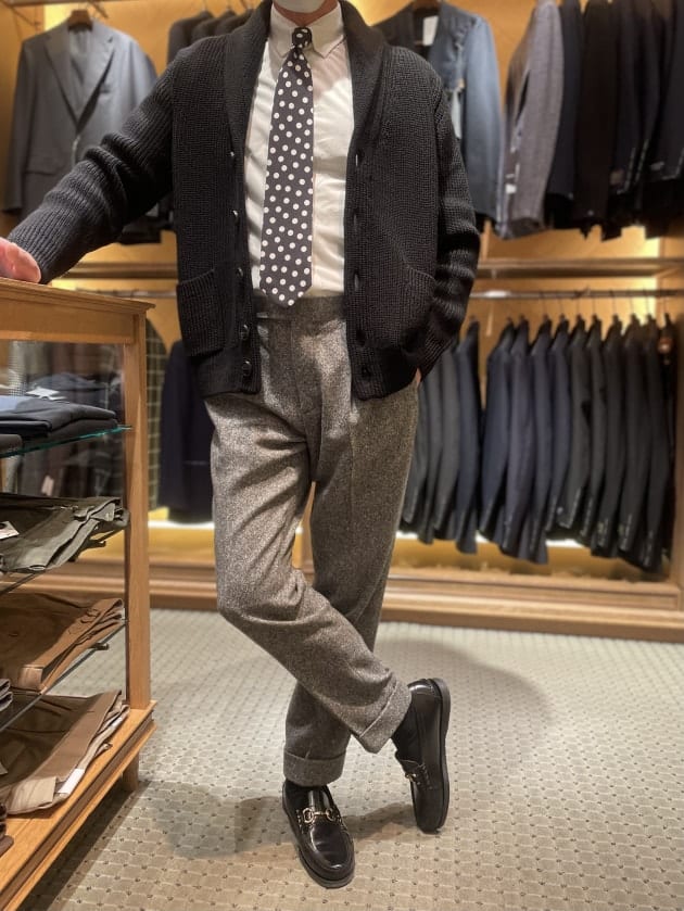 ニットは今シーズンも展開中のリブの感じが素敵な〈DRUMOHR(ドルモア)〉。N様着用画像のネイビーは昨シーズンご購入で、今シーズンはチャコールグレーも追加されてご購入。お気に入りニットは継続して展開していると色違いに手が伸びてしまいますよね。