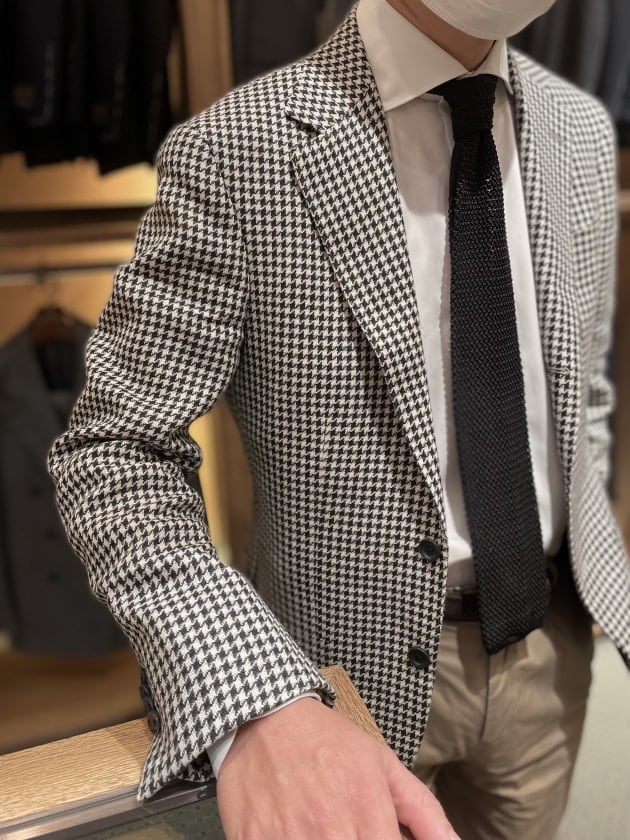 以前にお求めのBEAMS Fのモノトーンのハウンドトゥース柄ジャケットにホワイトシャツとブラックのニットタイ。トップスは完全にモノトーン。