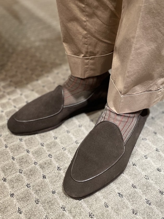 通年お履きいただけるデザインですが、ソックスの合わせが肝かなと。