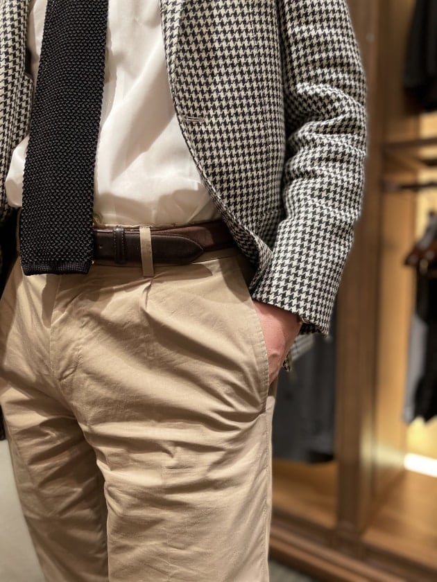 トラウザーズは2アウトプリーツのサイドアジャスター仕様。