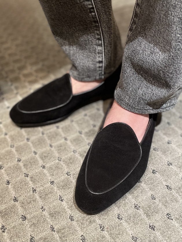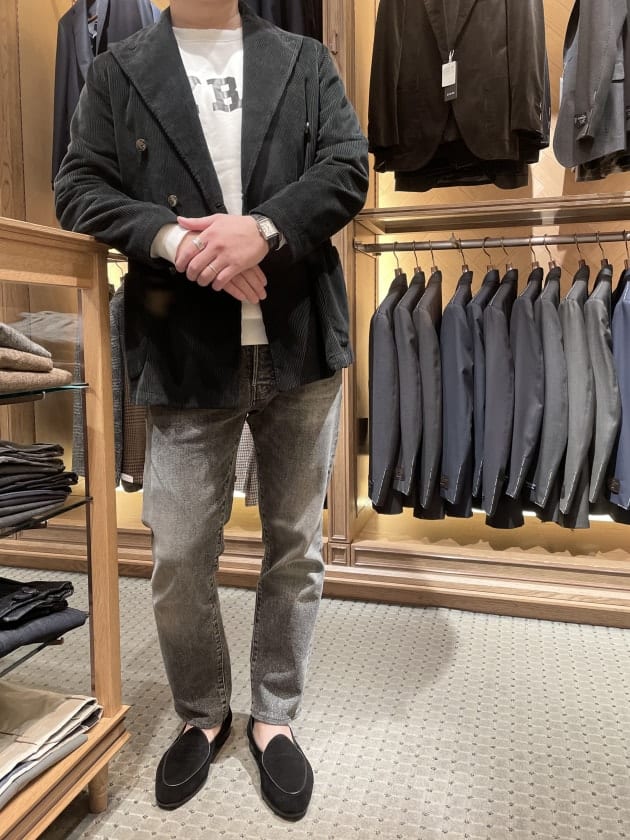 足元のブラックスエードのチャッカブーツも以前にお求めのものですが、こちらは今も展開しているシューズで店頭にもございますよ。