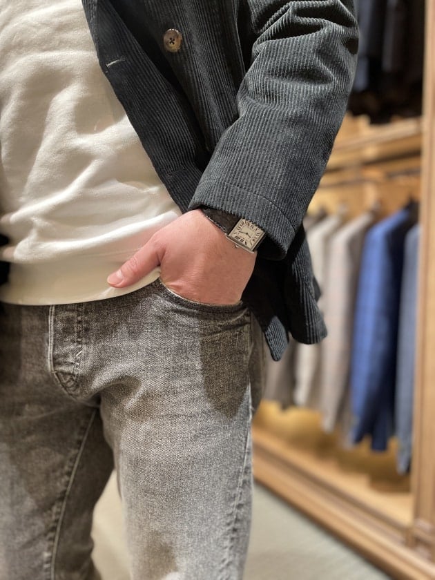 ホワイトのスエットの上に羽織ったブラックのコーデュロイジャケットは今シーズンの〈BAGUTTA(バグッタ)〉。おや、なんか様子がちがう?