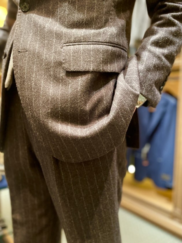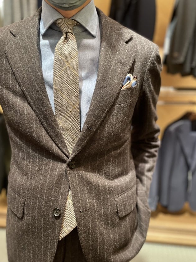 ダークブラウンのスーツは今ジーンズお求めのBEAMS FのFOX BROTHERSのストライプスーツ。ハンドラインです。