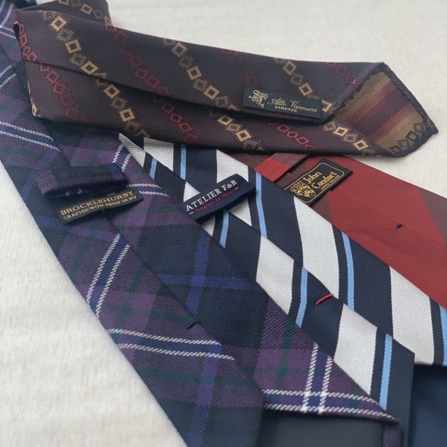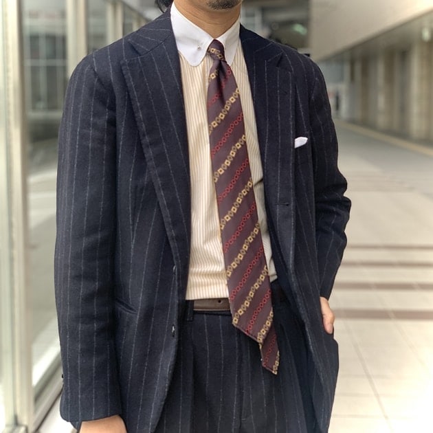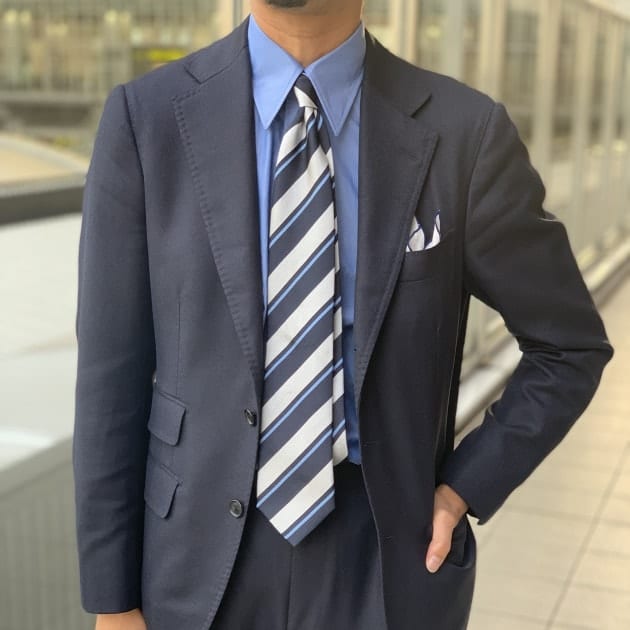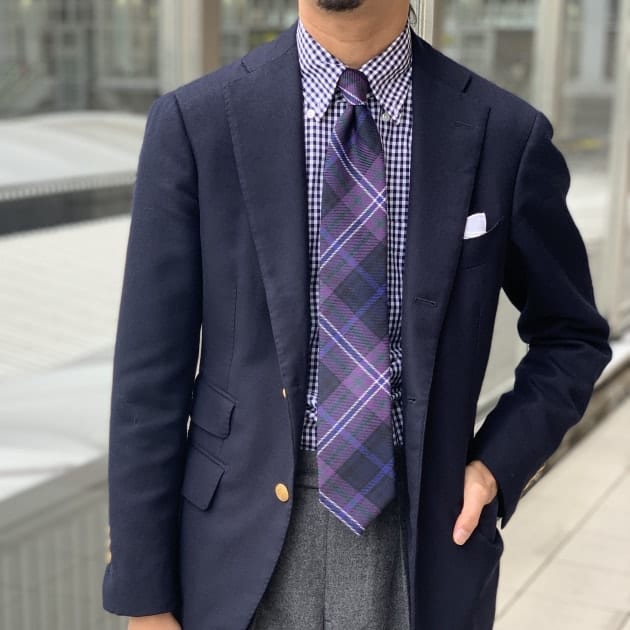 BEAMS Fの6つメタルボタンのブレザー。シャツは〈Brooks Brothers(ブルックス ブラザーズ)〉のホワイトのオックスフォードボタンダウンシャツ。タイはフランスの〈Atelier F&B(アトリエ エフ アンド ビー)〉のトリコロールカラーのストライプ。非常にシンプルで王道的な合わせですが、アメリカとフランスの合わせが何やらT様らしい。