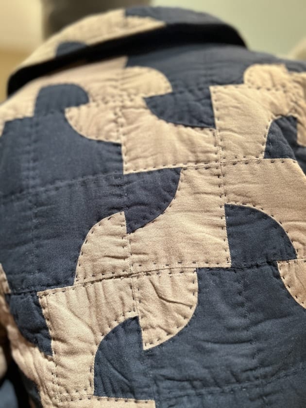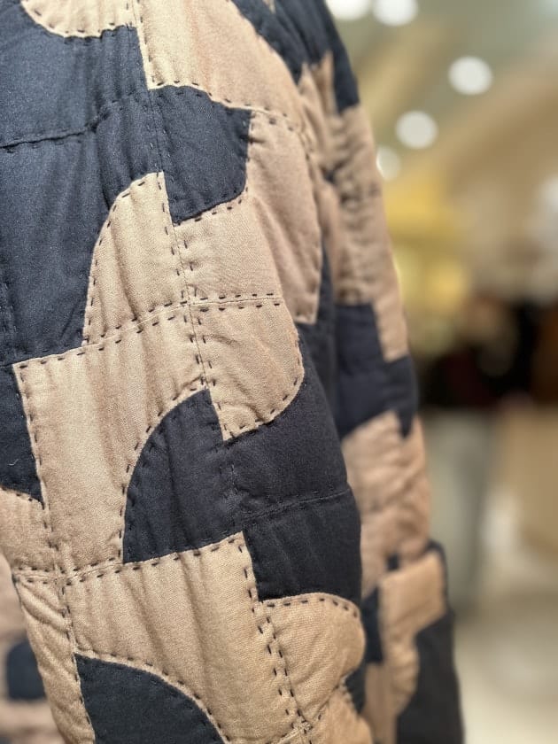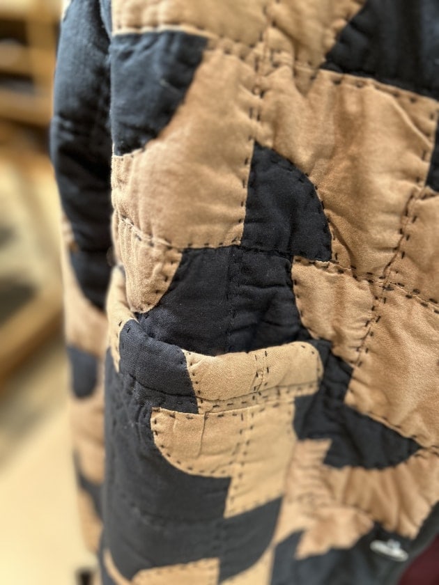 以前のブログでも紹介させて頂いているのですが、こちらは"ドランカーズパス"と言われる超技巧派なパッチワーク手法のひとつを施した一着。