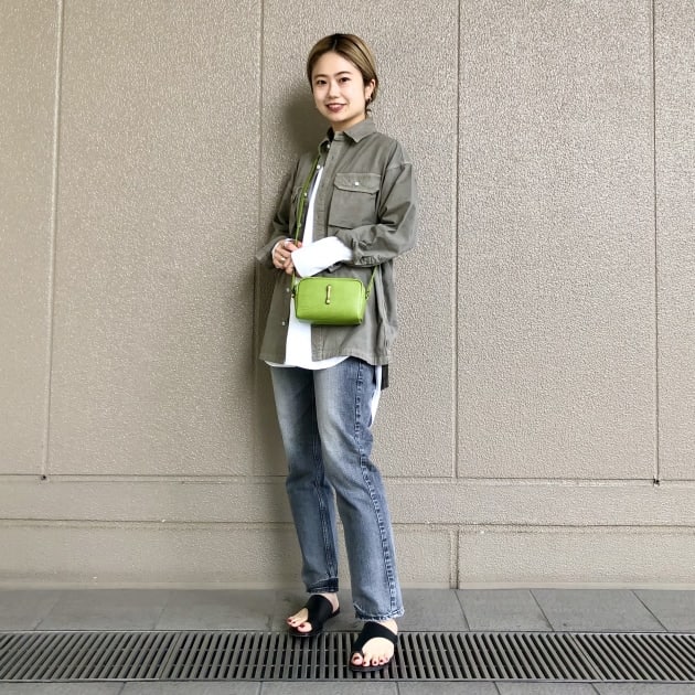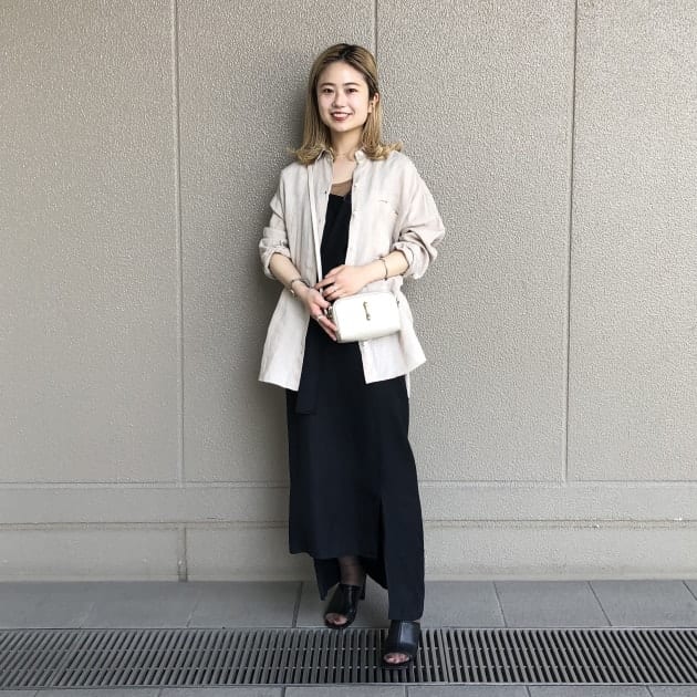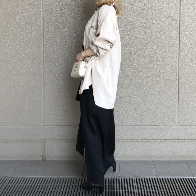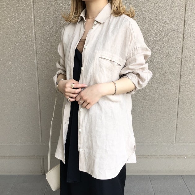 真夏のI様の大人のリネンシャツスタイリングはバッグやバングルといった小物をシンプルに楽しむところもポイント。やり過ぎないところにリスペクト。