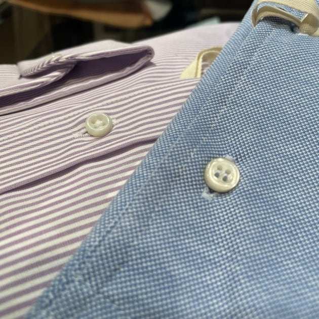 昨シーズンお求めの〈ALFONSO SIRICA(アルフォンソ・シリカ)〉の6つメタルボタンブレザー。インナーは〈GUY ROVER(ギローバー)〉のシャンブレークレリックラウンドカラーシャツに〈AD&C(エーディ アンド シー)〉のウールチェックタイ。ラウンドカラーにゴールドのカラーピンを使われるところは流石I様。