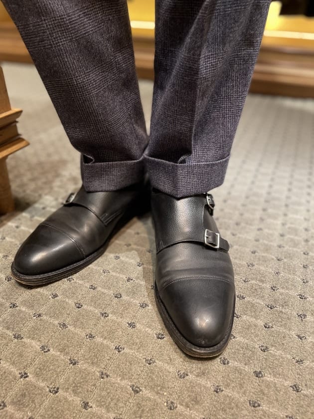 シューズはブラックのダブルモンクストラップ。