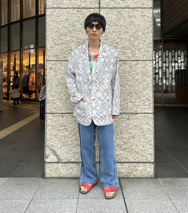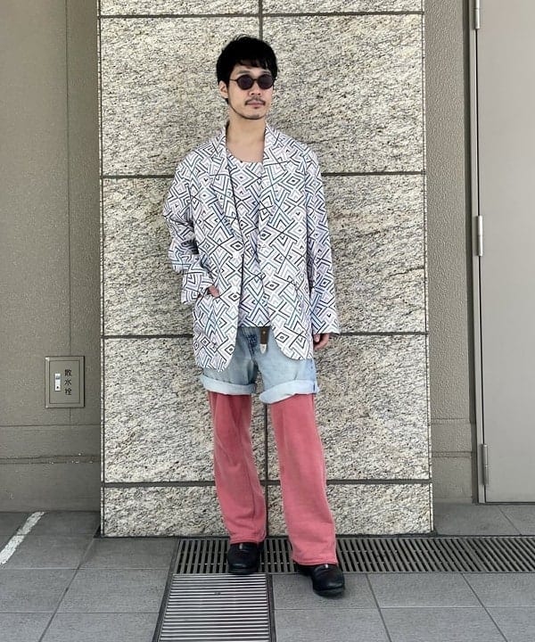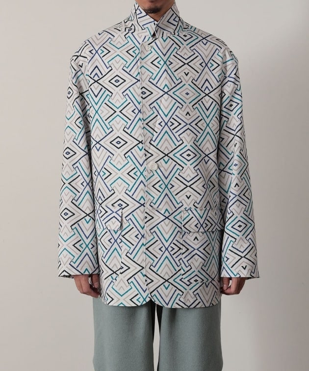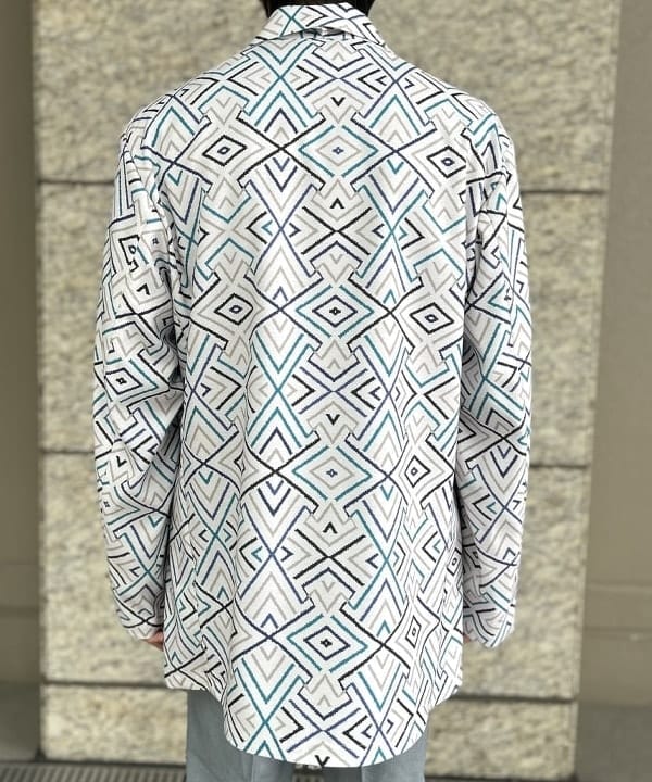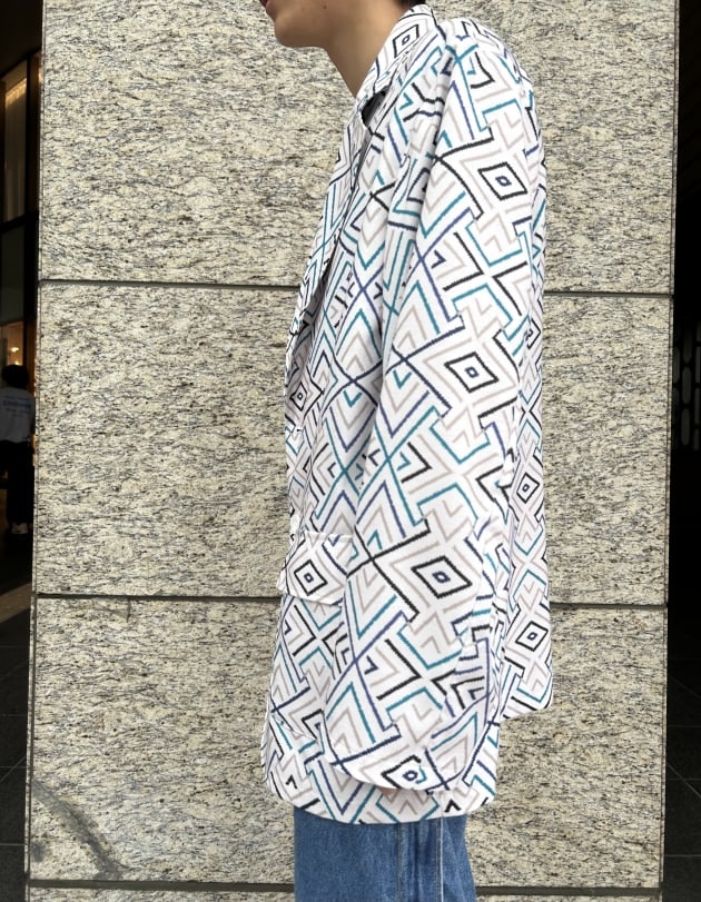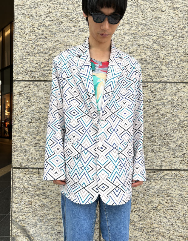 大きめのジオメトリック柄がインパクトあるこちらのテーラードジャケット。