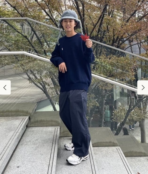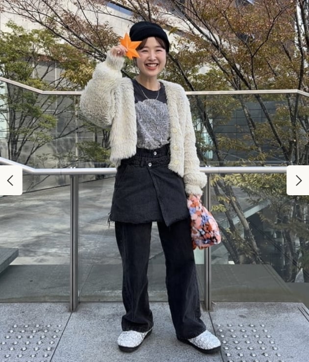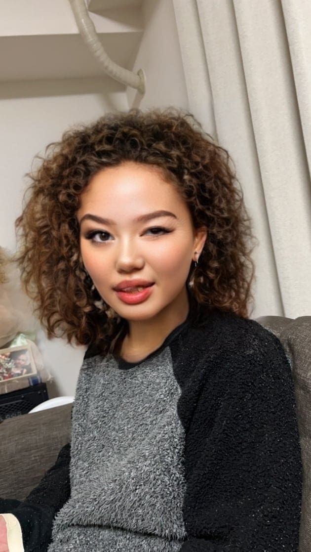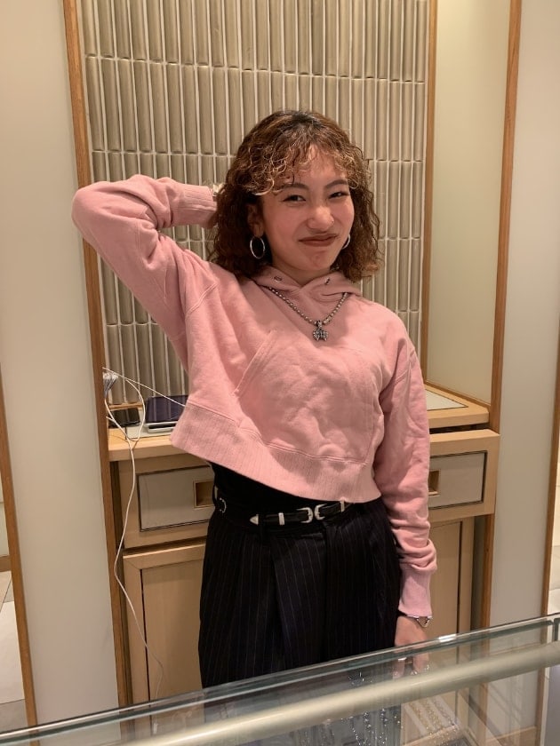 非常にカーリーなパーマヘアにゆるいサイジングのお洋服、クールなスタンスにハニカミスマイルでございましたが、