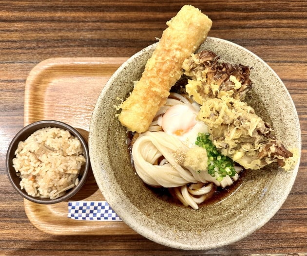 “ 鯛ちくわ天と温泉玉子のぶっかけとかやくご飯(小)のセット ”に、まいたけの天ぷらをトッピング♪