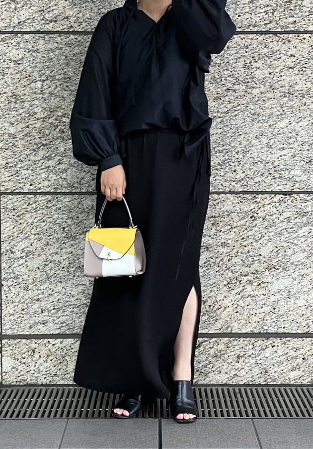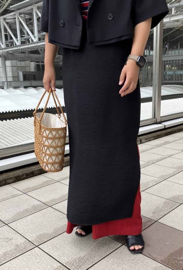 片方だけスリットが入っていて足捌きも良いですよ!スリットを活かして、カラーパンツを重ね着しても◎