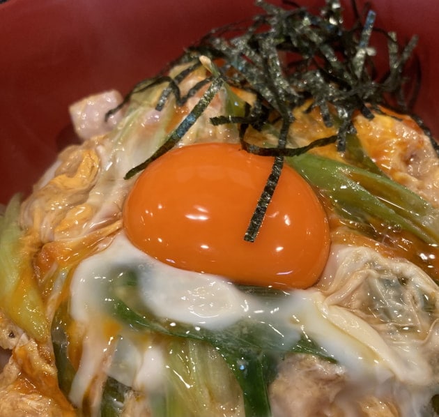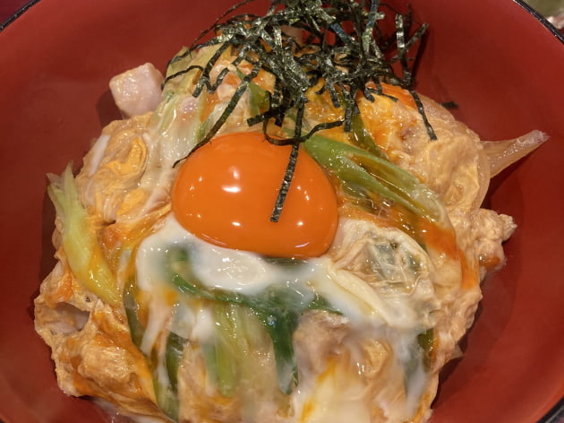 若干汁だくの親子丼。卵の加減はふんわりと仕上げられており、中央には“朝採りの卵黄”が鎮座。