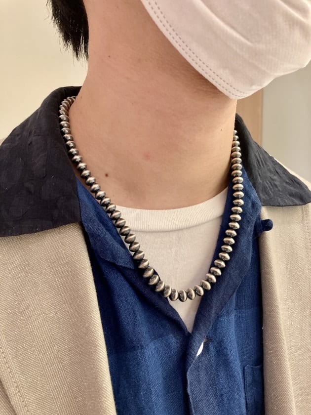 ナバホ族(*1)のシルバースミス家系(*2)では伝統的にビーズ作りが盛んらしく、中でも算盤のような形状をしているモノがもっとも馴染み深い形。