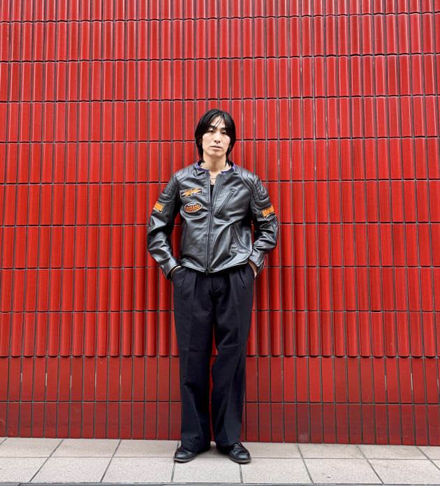 トップスには、ハードなレザージャケットを。カジュアルなアイテムと上品なスラックスを組み合わせることで、こなれ感のあるストリートスタイルが完成します。足元はレザーシューズで引き締め、全体のバランスを整えるのがポイントです。