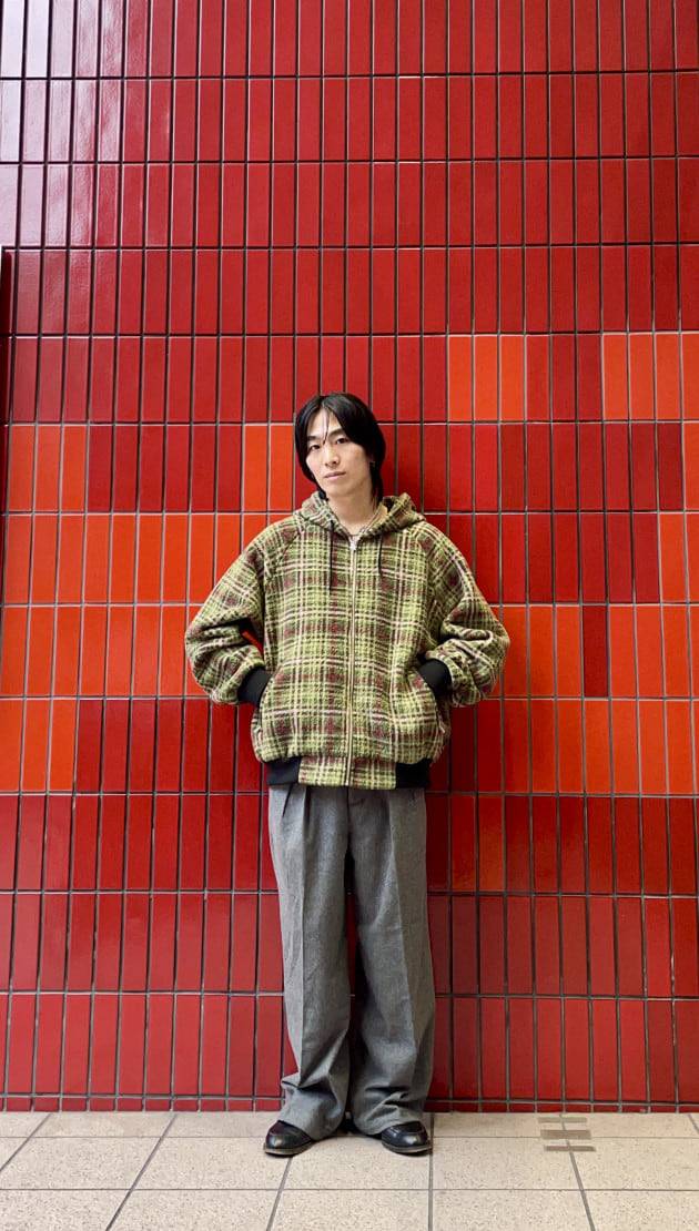 暖かみのあるチェック柄のブルゾンを合わせたスタイル。スラックスのグレーが、個性的なトップスの色味を落ち着かせ、統一感のある大人のカジュアルルックに。