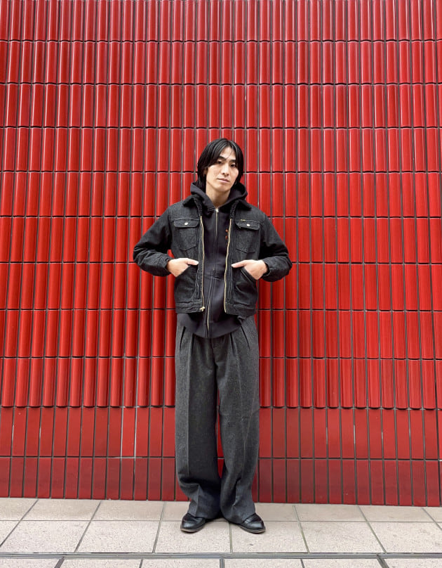トップスとインナーをブラック〜ダークトーンでまとめ、シックなワントーン風に。カジュアルなデニムジャケットも、このダークトーンとワイドスラックスの組み合わせなら、洗練された印象に変わります。是非ご参考に!