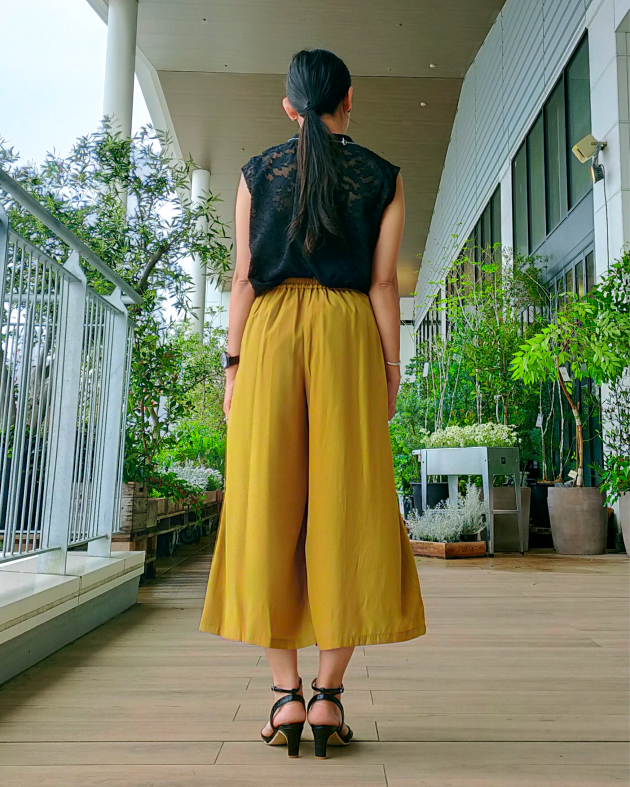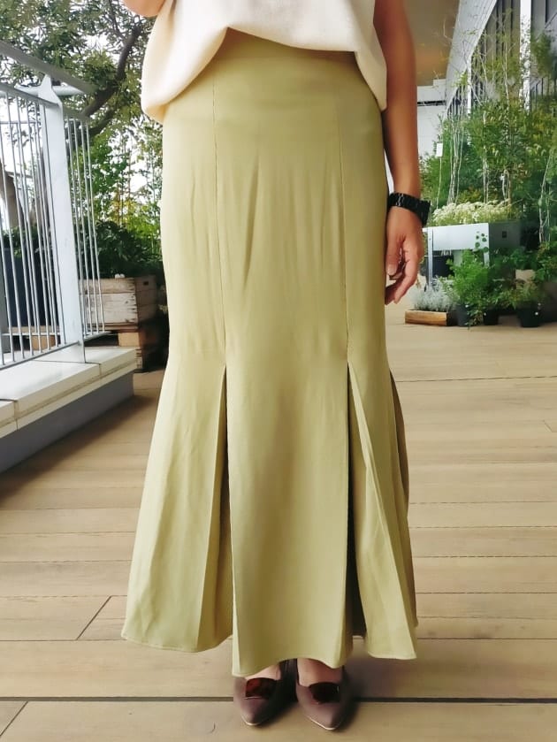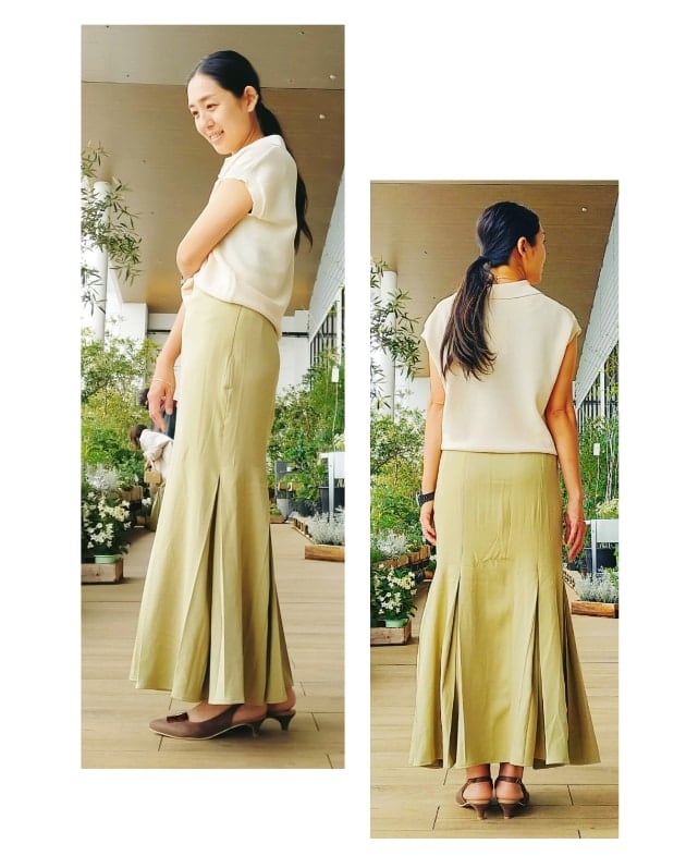 裏地は少し短めになっており、足首あたりは透け感があって低身長の方でも重たくならず着用していただけます。