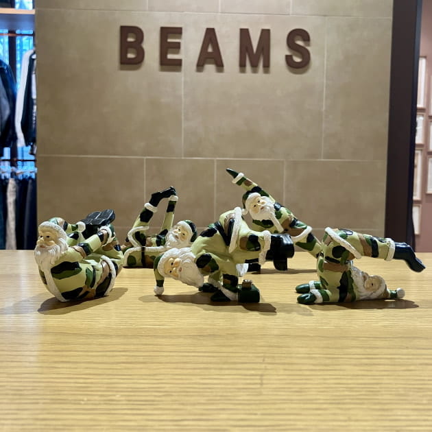 迷彩服を着たサンタクロースが、ヨガのポーズをしている置きもの。