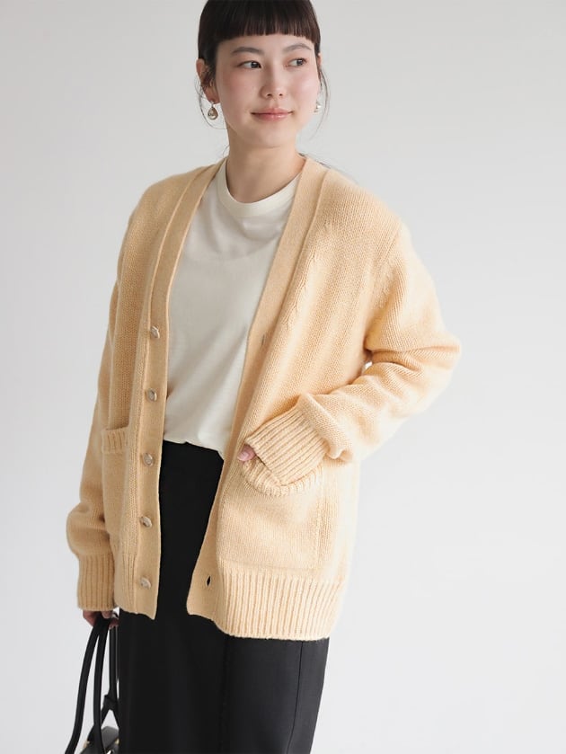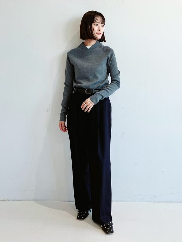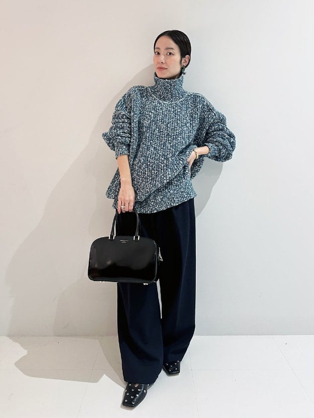 冬の街並みにパッと映える、クリーンなオフホワイトが魅力の〈TICCA〉のピーコート。伝統的なアイテムを現代的なゆとりあるシルエットに落とし込み、厚手のニットの上からでも羽織れるリラックス感が特徴です。絶妙なハーフ丈は、今回のようなワイドパンツはもちろん、ロングスカートとも好相性でボトムスを選びません。足元をビットローファーで引き締めれば、通勤から休日のお出かけまで対応する、上品な大人のトラッドスタイルが完成します。