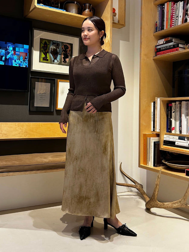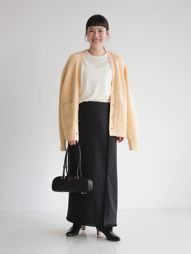 暖かみのある赤系のチェック柄が、秋のムードを運ぶロングスカート。この主役級スカートに、あえて〈P.A.M.〉別注のクールなドライバーズニットを合わせる「アンバランス感」を楽しむのがポイント。ニットのWジップを裾から開け、スカートにつながる美しいAラインを作ることで、スタイルアップ効果も!仕上げにファーバッグを投入すれば、ぐっと季節が深まります。甘さと辛さが絶妙な秋色コーディネートです。