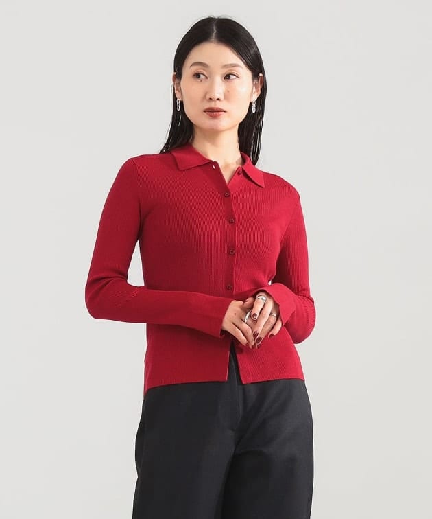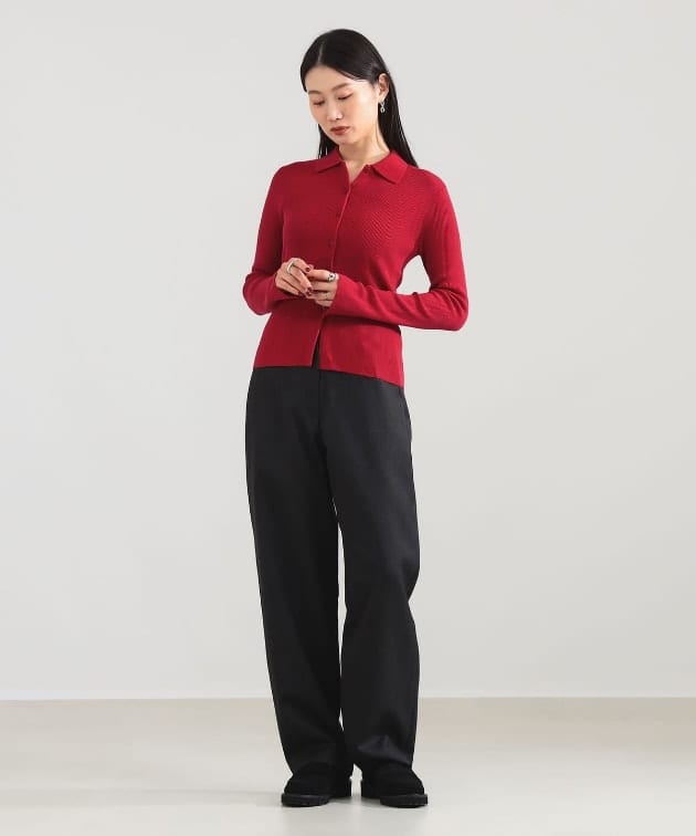 まだ暑さが残る季節から秋を意識するなら、まずは「色」から取り入れるのが正解です。こっくりと深みのあるボルドーのボトムスが、一気に秋のムードを運んできます。合わせたのは、程よい透け感が涼しげなブラックのサマーニット。今の時期から無理なく着られ、シックな配色が大人の女性らしさを演出します。小物も黒で統一することで、洗練された印象に。晩夏から楽しめる、お手本にしたいスタイルです。