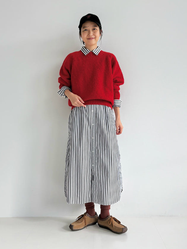 赤のチェックスカートが主役のフェミニンスタイル。この着こなしの完成度を高めているのが、足元のスニーカーです。フェミニンなAラインスカートに、あえてスポーティーな〈NIKE(ナイキ)〉のスニーカーを合わせることで、甘さを程よく抑えた「甘辛ミックス」な着こなしに。スカートとトップスのロゴの赤を主役に、足元はシックなダークカラーで引き締めているのも計算されたポイント。女性らしいスカートスタイルに、親しみやすさとトレンド感を加える、お手本にしたいテクニックです。