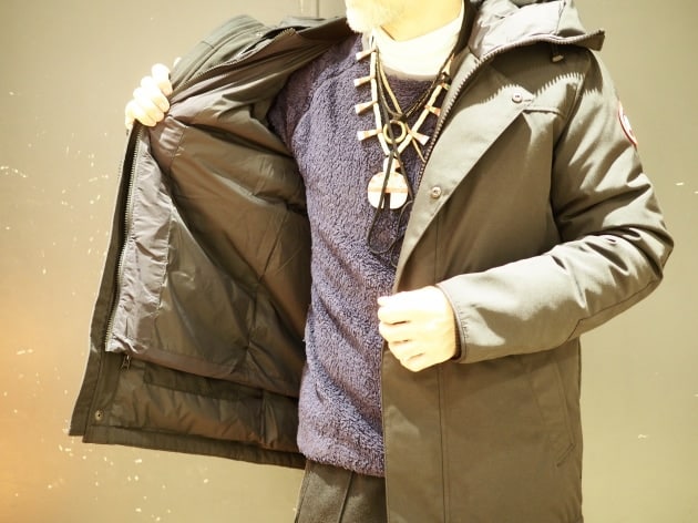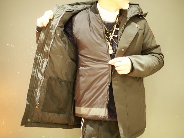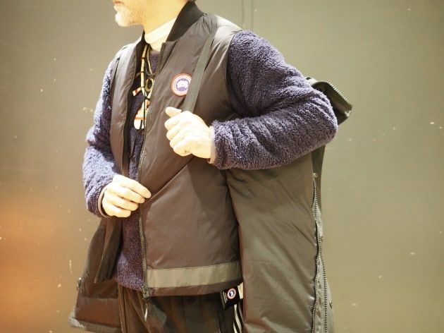 今の時代にあったルーズフィット。スナップボタンに沿う様に配線コードを通し、通信機をポケットに収納します。