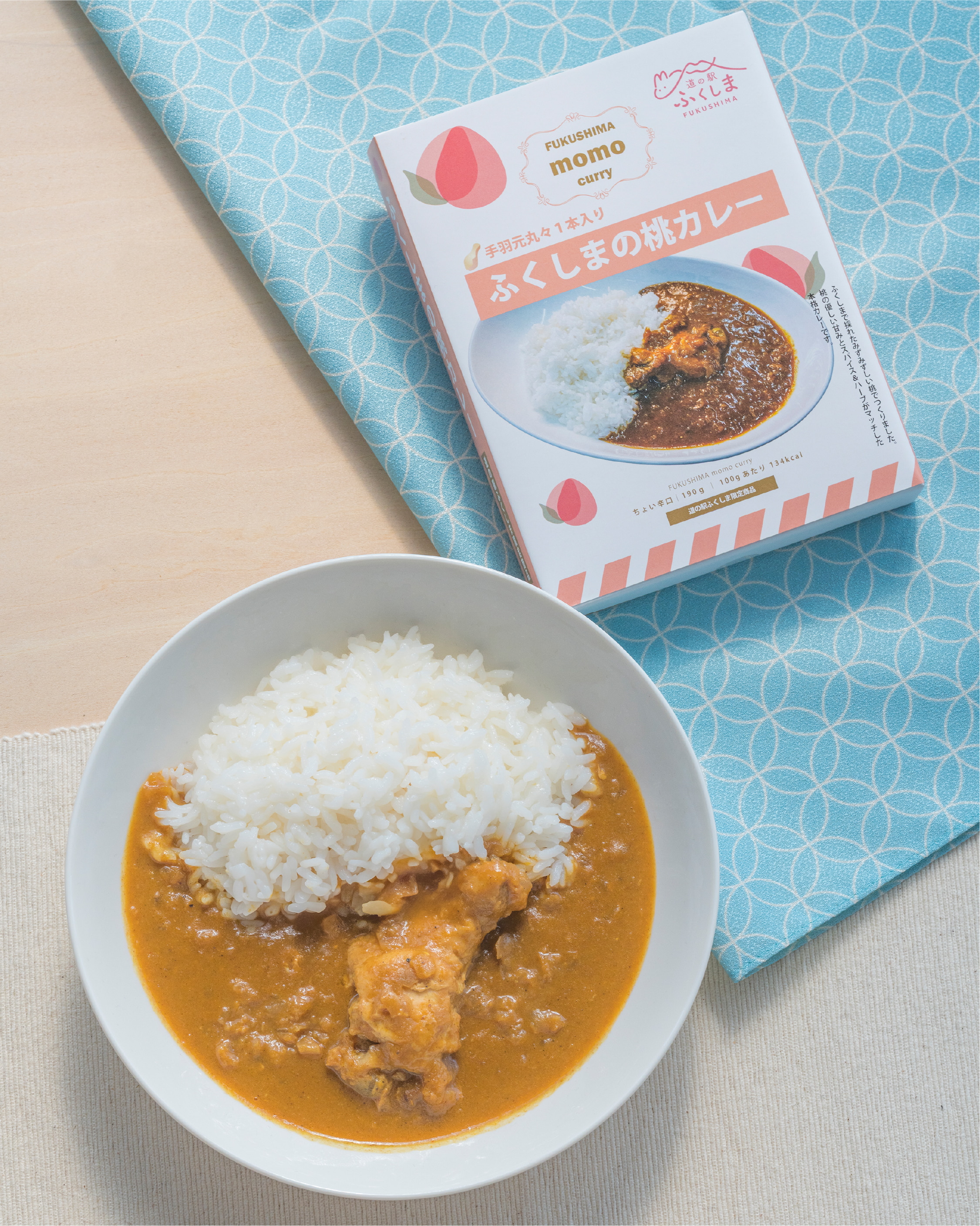 福島県産桃と野菜などの水分のみで作られたオリジナルレトルトカレー。スプーンでほろほろほぐれる大きな手羽元一本入り。