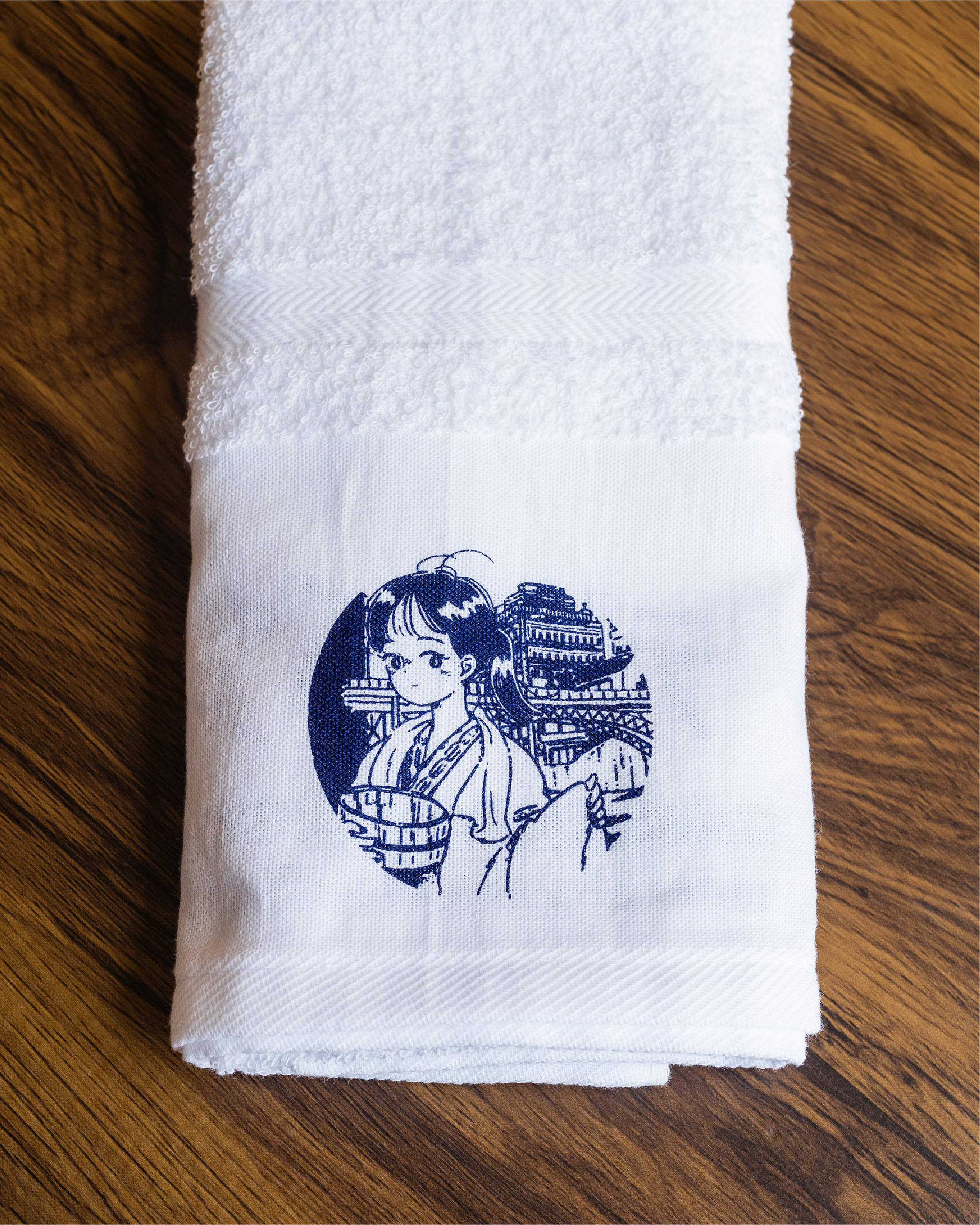 イラストレーターmame氏作、“湯上がりコーデ”女子のイラストがプリントされた温泉タオル。綿100%。