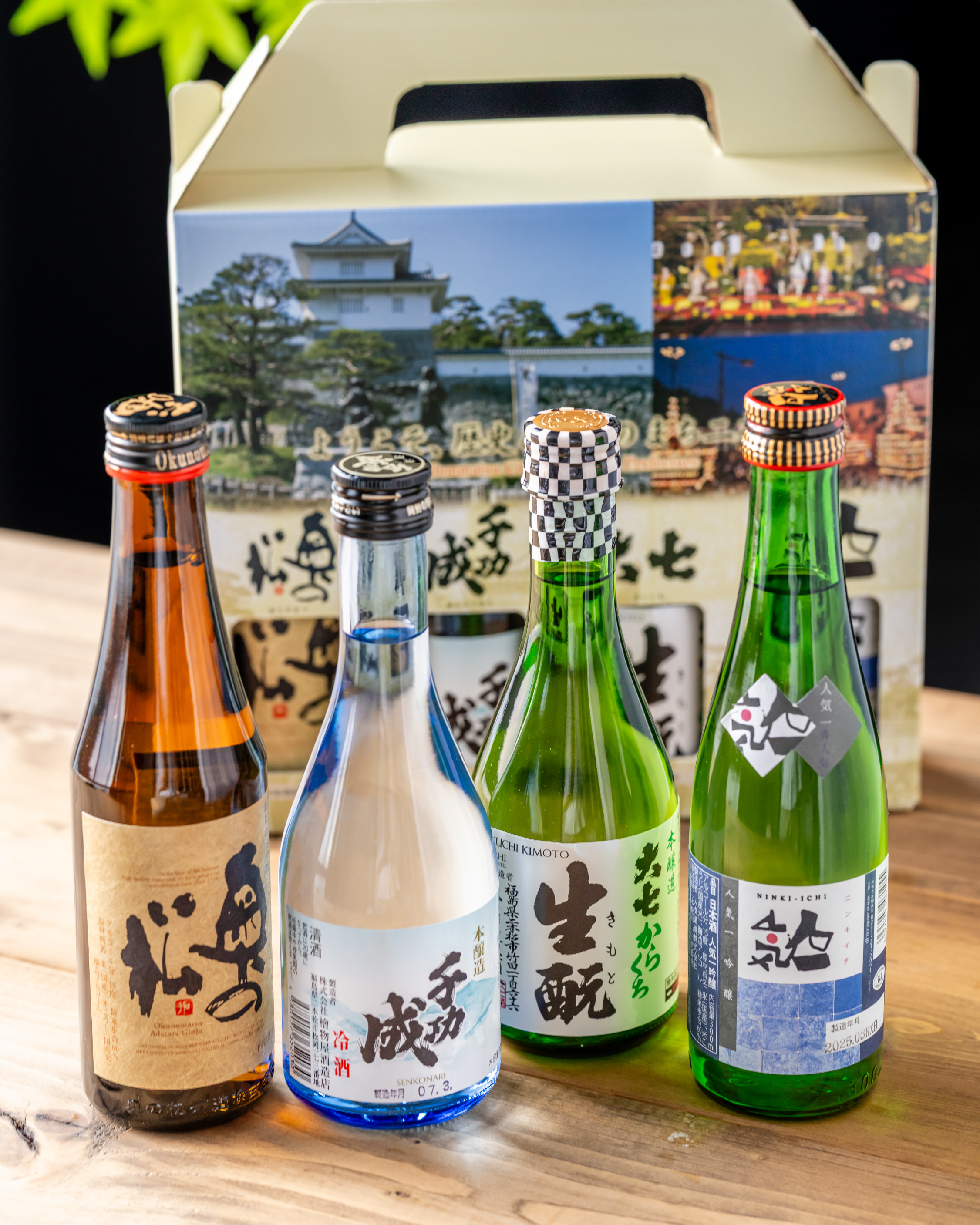 二本松の日本酒4蔵『奥の松』『千功成』『大七』『人気一』をセットに。1本300mlと呑み比べに嬉しいサイズ。