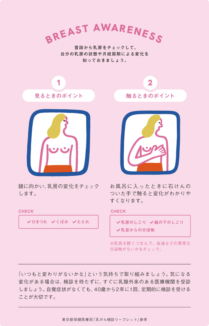 日本の女性が最もかかりやすいがんが乳がんで(*1)、早期発見と早期治療で90%以上の人が助かる(*2)という現状を受け、まずは乳がんを正しく理解するための情報発信と、日常的に胸の状態を意識するブレスト・アウェアネスの習慣を身につけるためのきっかけ作りに、ビームスの店舗、公式サイト、SNSなどで取り組みます。