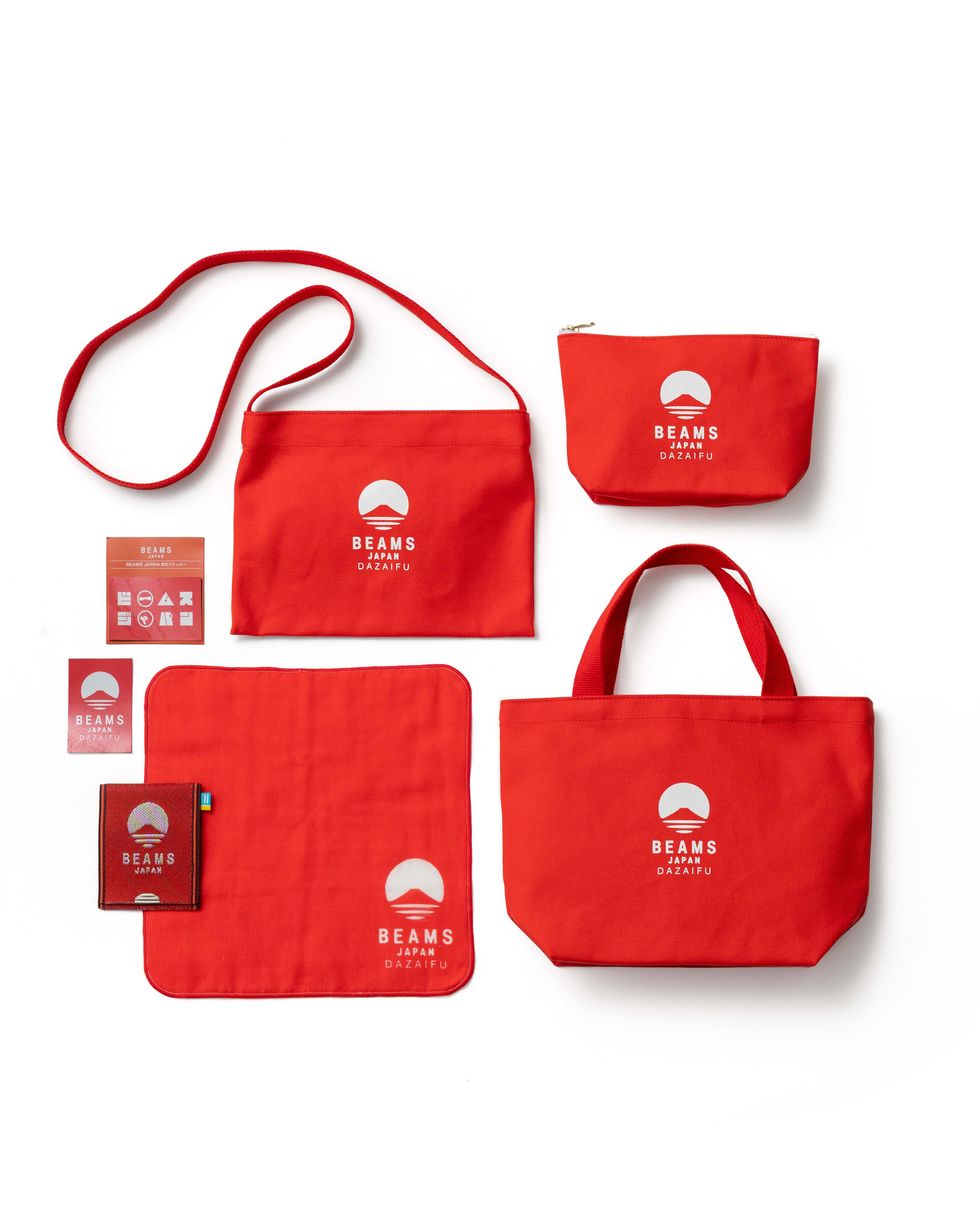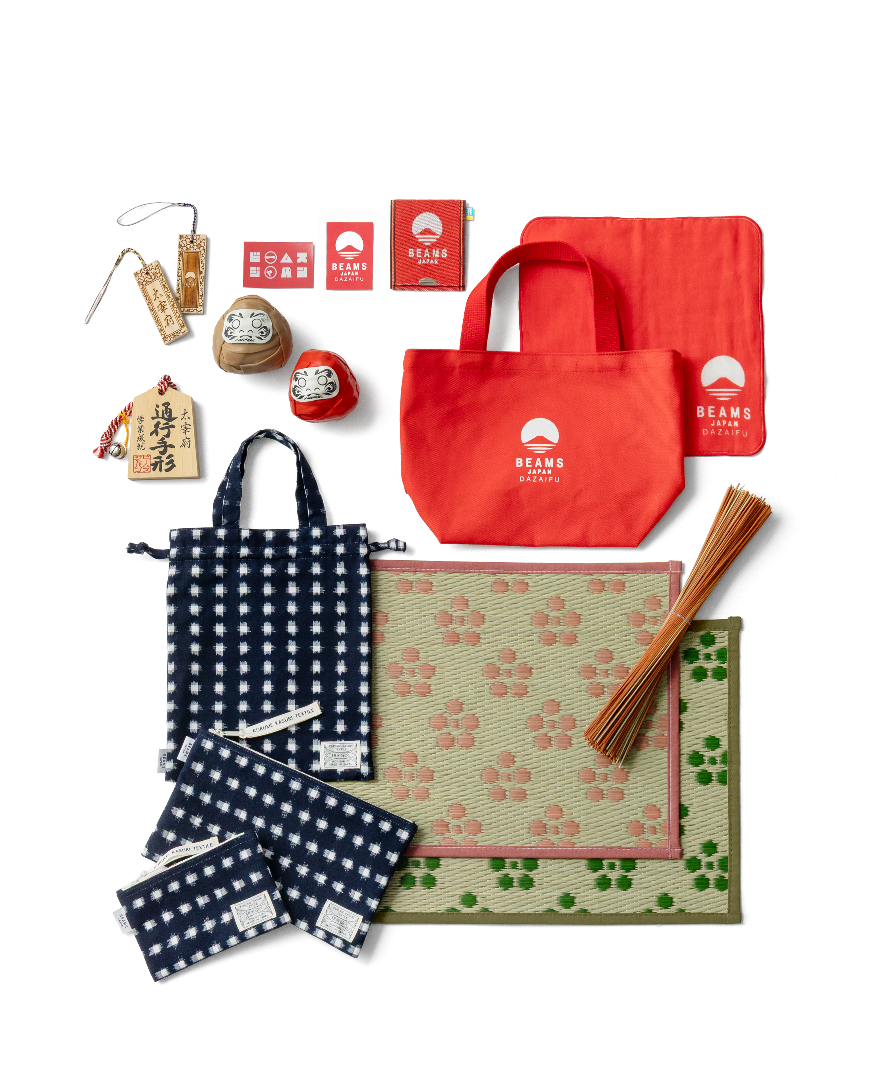 「ビームス ジャパン 太宰府」では、店舗限定のコラボ商品として、福岡の久留米市を拠点に150年以上の歴史を誇るシューズメーカー〈MOONSTAR〉が、スニーカーをヴァルカナイズ製法(※)を用いて製作する過程で生じた端材を、日本ならではの縁起物に利活用した「ラバーだるま」を展開します。さらに、国の重要無形文化財である「久留米絣」を使用した〈オカモト商店〉による巾着トートやポーチ類の一部では、寺社めぐりにも携行できる御朱印帳にぴったりのサイズも製作しました。他にも、福岡県の伝統工芸品である「福岡花ござ」を使用した〈イケヒコ・コーポレーション〉の雑貨類や、県内で住宅資材を製造する就労継続支援A型事業所<ボクらの仕事場>が手がけた、九州産ヒノキを使用した木製のキーホルダーを取り扱います。また、店舗限定「ビームス ジャパン 太宰府」のロゴ入りトートバッグやランチバッグには、菅原道真公が愛した梅から着想し「紅梅」を想起させる赤みがかったカラーを採用しました。また店舗限定商品以外にも、BEAMS JAPANのバイヤーが仕入れた日本全国の銘品も展開します。