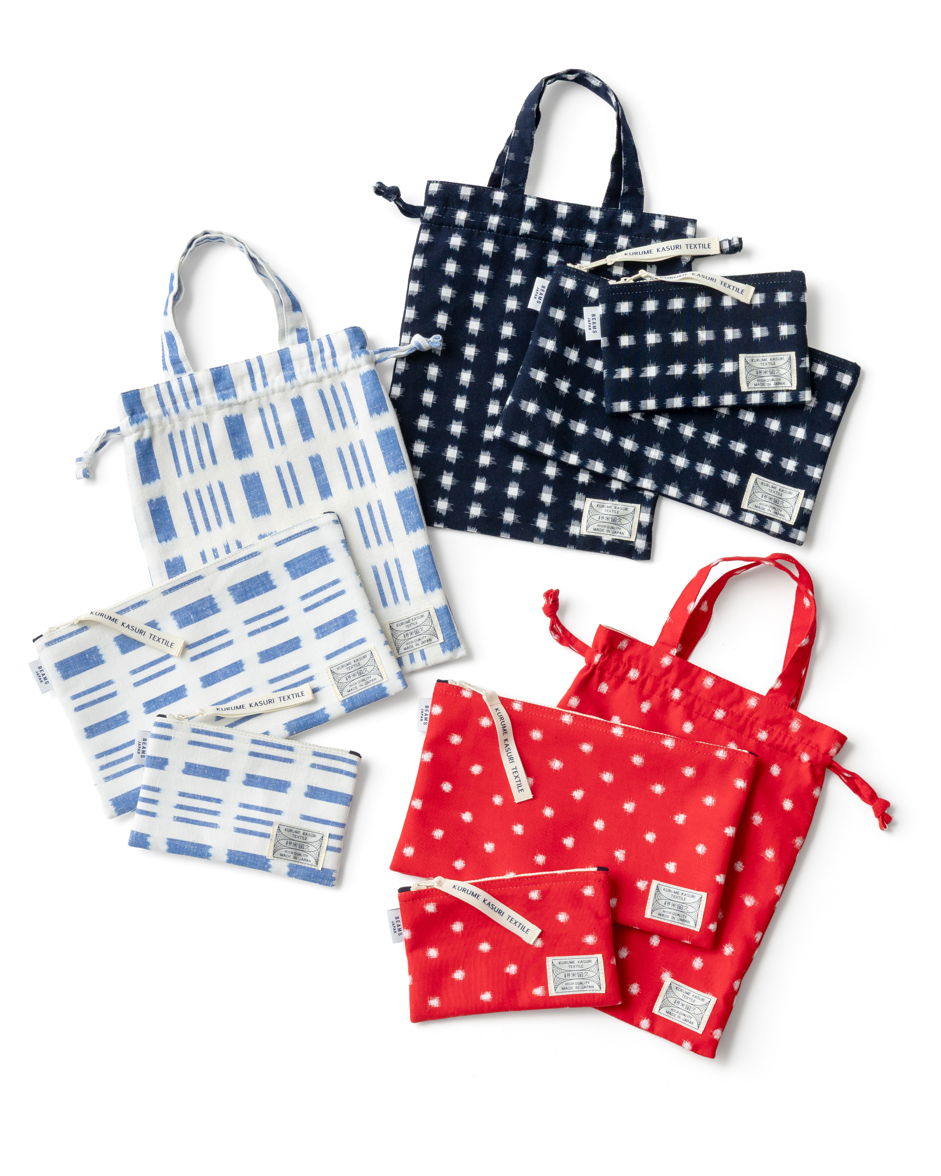 220年以上の歴史を有する「久留米絣」の生地を使用した商品を製造販売する〈オカモト商店〉の巾着トートやポーチ類。大きいサイズのポーチは、御朱印帳が収まるサイズに企画している。