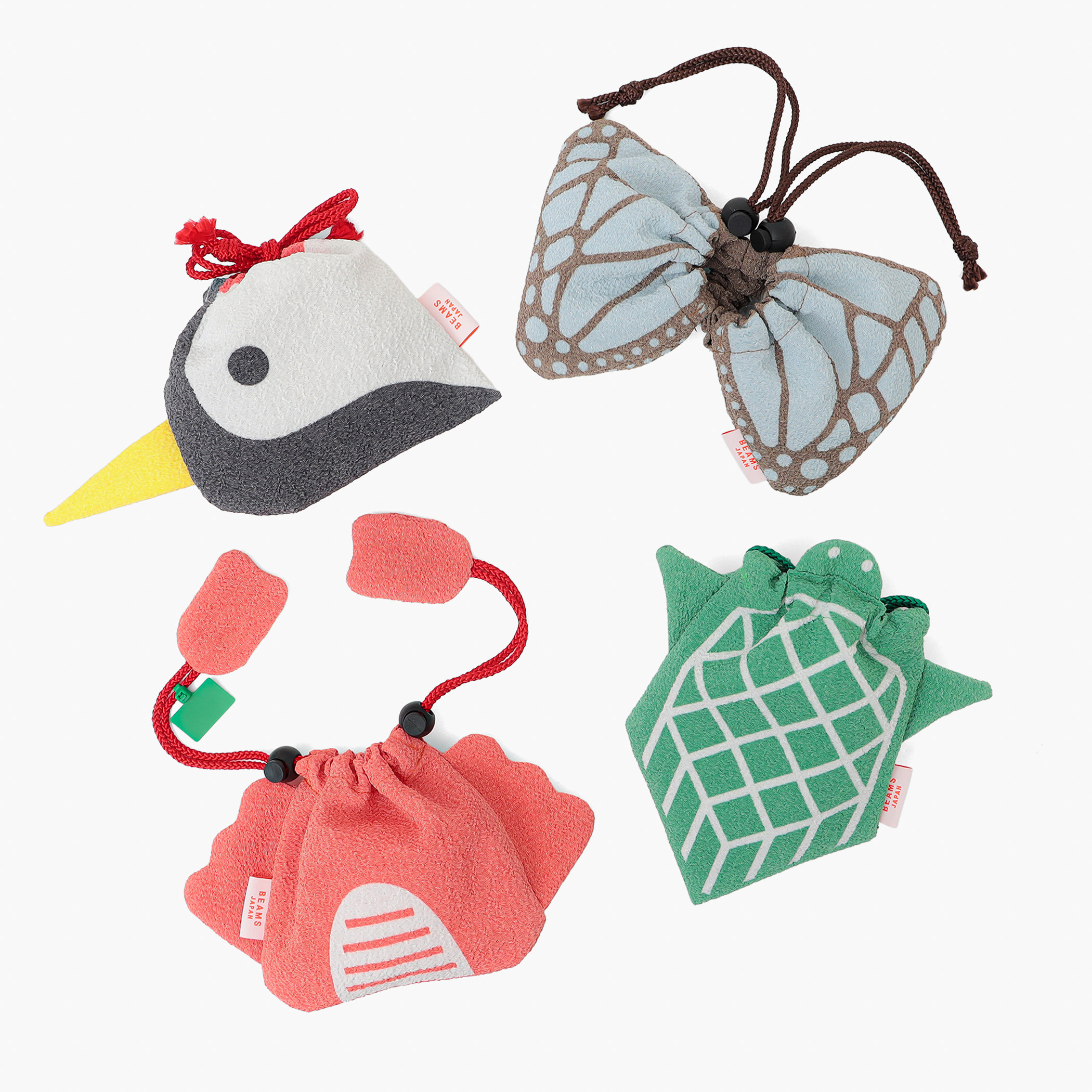 京都府北部の丹後地域特有の後染め織物「丹後ちりめん」で作られた「ビームス ジャパン 舞鶴」限定商品の巾着は、舞鶴に由来する鶴・亀・蟹・蝶のモチーフを、同地域にゆかりのあるデザインユニットCOCHAE(コチャエ)が手がけたオリジナルデザイン全4種からお選びいただけます。